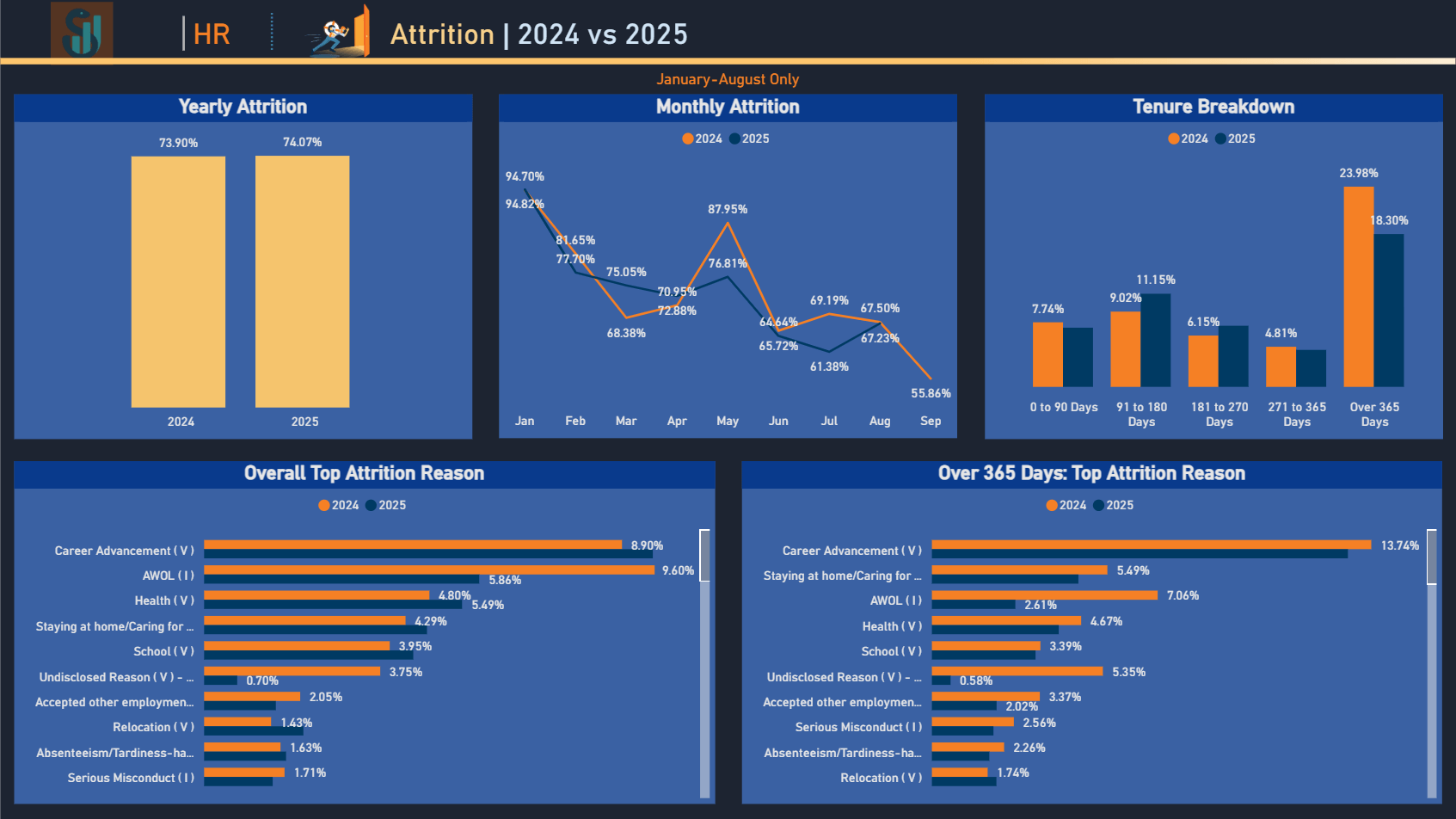 Scalable Power BI dashboard monitoring workforce retention across 40+ BPO client projects. Features complex SQL transformation layers and dynamic DAX models to drive retention strategies.