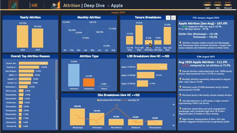 - Developed the 'Enterprise Attrition Dashboard' to track retention trends across US operations, enabling data-driven interventions.
